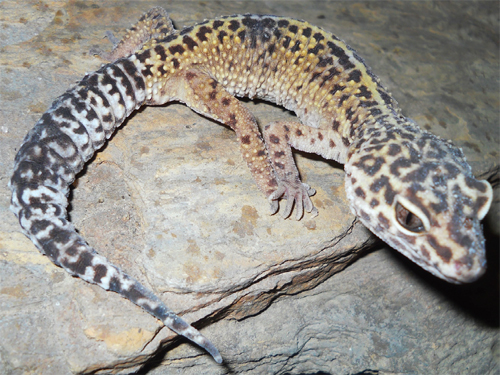 Le Gecko Leopard est originaire des régions sà¨ches semi-désertiques ou des steppes de l’Afghanistan, du Pakistan, de l’ouest de l’Inde, et de l’est de l’Iran. L’adulte a une robe beige ou jaune mouchetée de noir ou de brun trà¨s foncé. Ces couleurs et ce dessin lui valent son surnom de gecko léopard. Sa queue enrobée constitue une réserve de graisse, ce qui lui permet de pallier le manque de nourriture et d’hiverner. La peau d’Eublepharis macularius est comme granuleuse, garnie de petites protubérances, avec un aspect rappelant la texture du velours. Le ventre est blanc translucide. Les yeux à l’iris marron ou doré possà¨dent des paupià¨res mobiles et une pupille verticale. Ses paupià¨res permettent à Eublepharis macularius de se protéger des particules dans un environnement naturellement poussiéreux. Les membres sont courts et les 5 doigts sont garnis de griffes. Le gecko léopard peut abandonner sa queue par réflexe de défense, et celle-ci ne repoussera que sous la forme d’un moignon. - Longévité : 15 ans – Poids : 60 g – Taille : 20 cm |